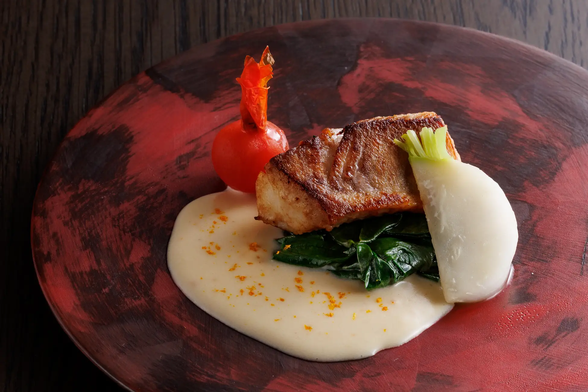 中はしっとり、皮は香ばしく仕上げた銀鱈と、柚子が爽やかに香るクリームソース