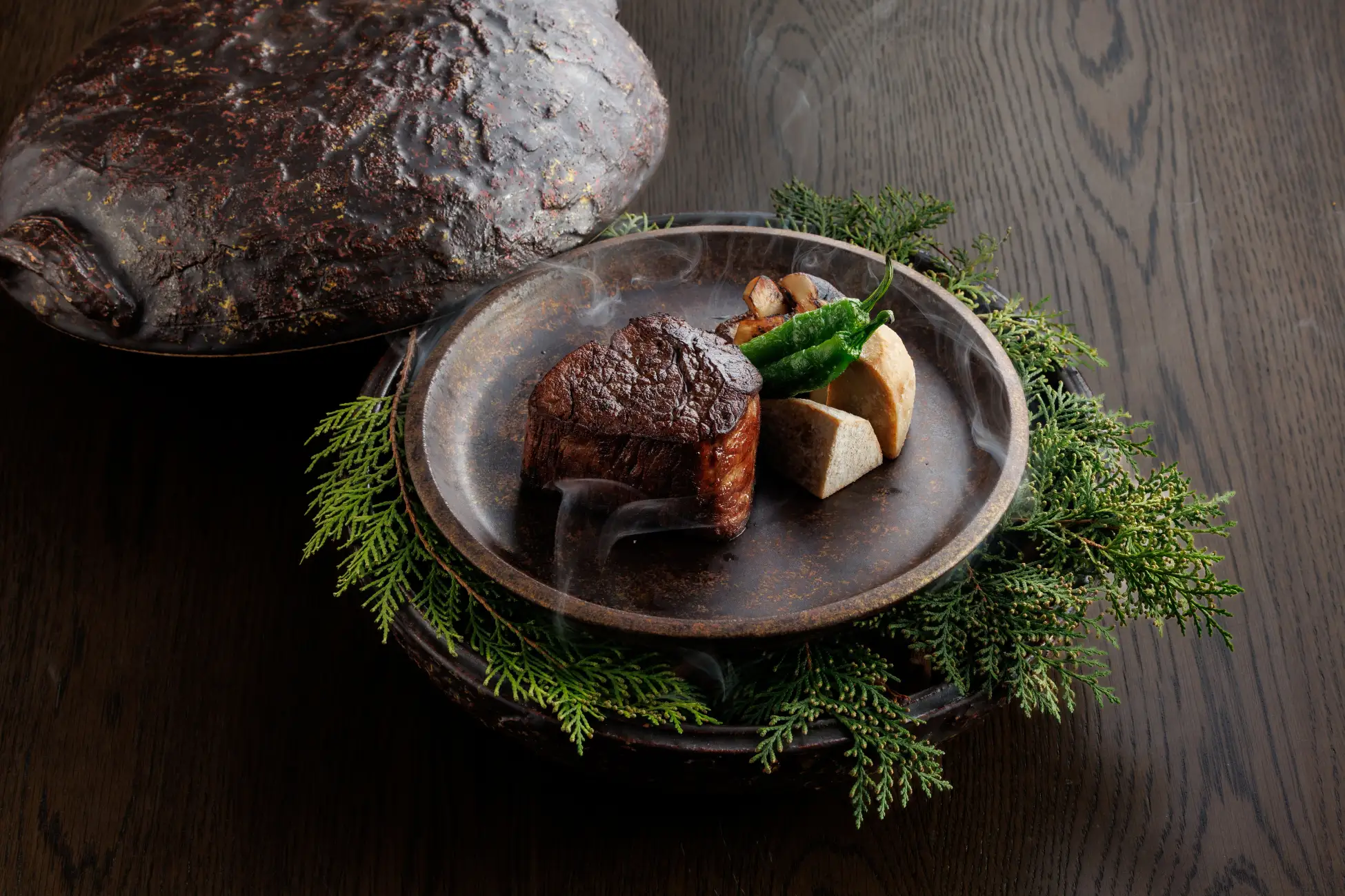 薪場で焼き上げた和牛は、ぎゅっと閉じ込められた旨味と、ほのかに感じられる薪の香りで奥深い味わい