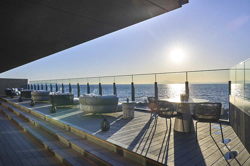4階にしつらえたルーフトップラウンジ「宵星(よいぼし)」では、水平線が遮るものなく眼前に広がります。