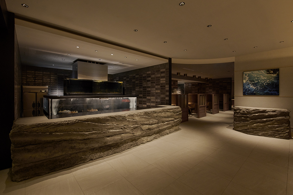 レストランの入り口には生簀(いけす)を備え、この土地の魚介や全国から届く旬の素材が揃います。